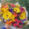 Декораторы – флористы постарались в эксклюзивном букете «Девичий восторг» через цветы отобразить всю гамму чувств юной прелестницы. Разнообразием красок и великолепным сочетанием цвета манят к себе солнечно-желтые герберы и хризантемы, розовые и персиковые бутоны роз, малиновая фрезия и фиолетово-синяя эустома. Хрупкую красоту цветов подчеркивают белые и золотистые фольгированные листы оберточной бумаги.